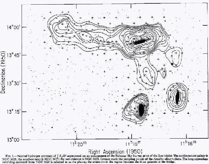 HI outflow from NGC3628 is shown in the negative plate at right, from Haynes, Giovanelli & Roberts 1979 ApJ 229 83. The HI contours tell a plain story of gas which is venting out of NGC3628 and filling up a gravitational bowl around the galaxy, then overflowing the lip of the bowl towards the left and flowing viscously into the intergalactic medium (IGM), free of the gravitational influence of its parent galaxy. There is also a smaller flow to the south. The significance of this picture is that NGC3628 has a clearly defined gravitational boundary not far from the visible disk. This contradicts a major tenet of "dark matter" astronomy that galaxies have enormous haloes of material which extend very far away from the visible galaxy. |